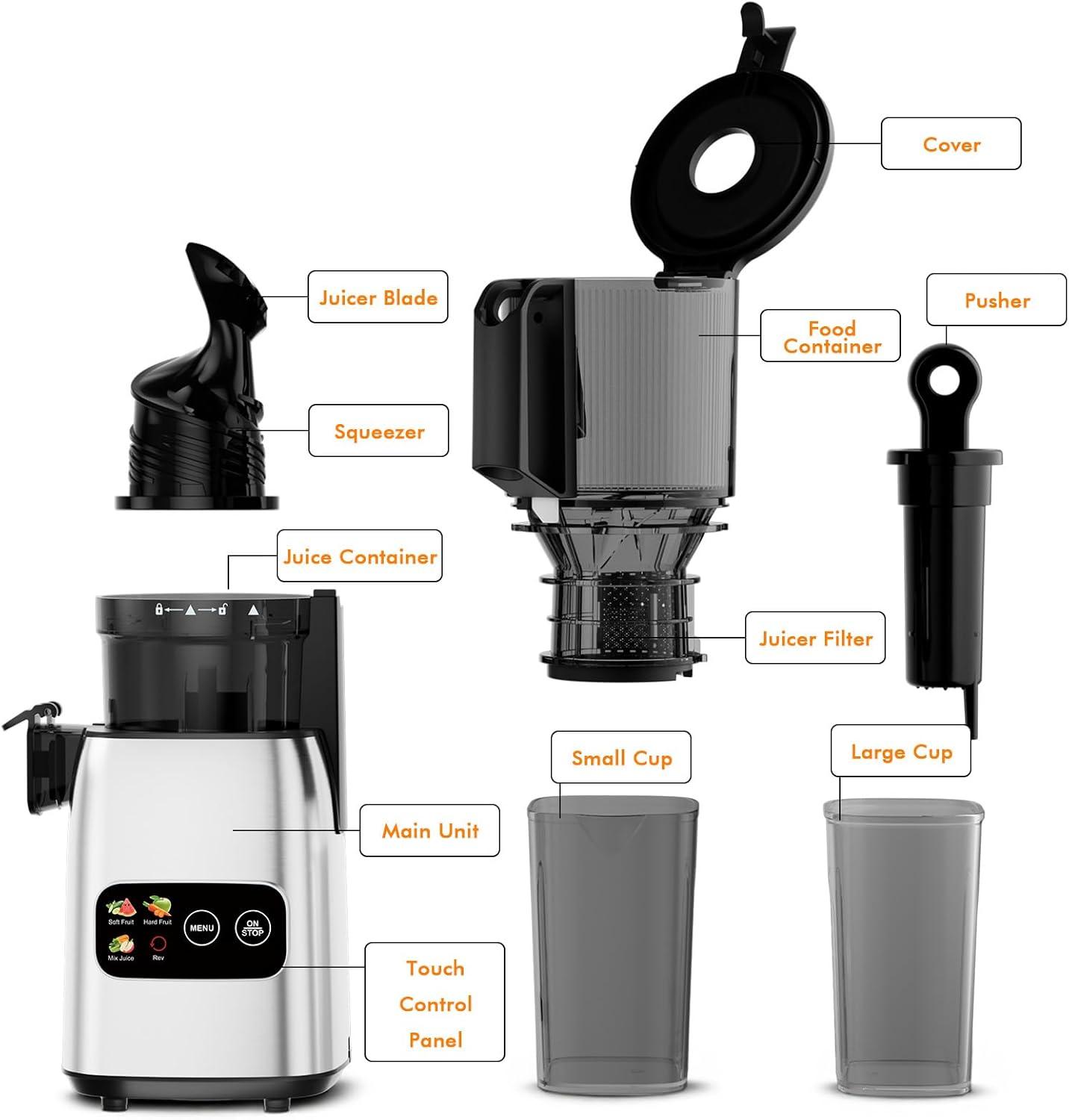 Kismile 300W Cold Press Juicer, 5.4" Wide Feed Chute, Slow Masticating Juicer Machines Vegetable and Fruit, Electric Juicers Juice Maker with Reverse Function, Stainless Steel Juicer Easy to Clean(Black&Silver)