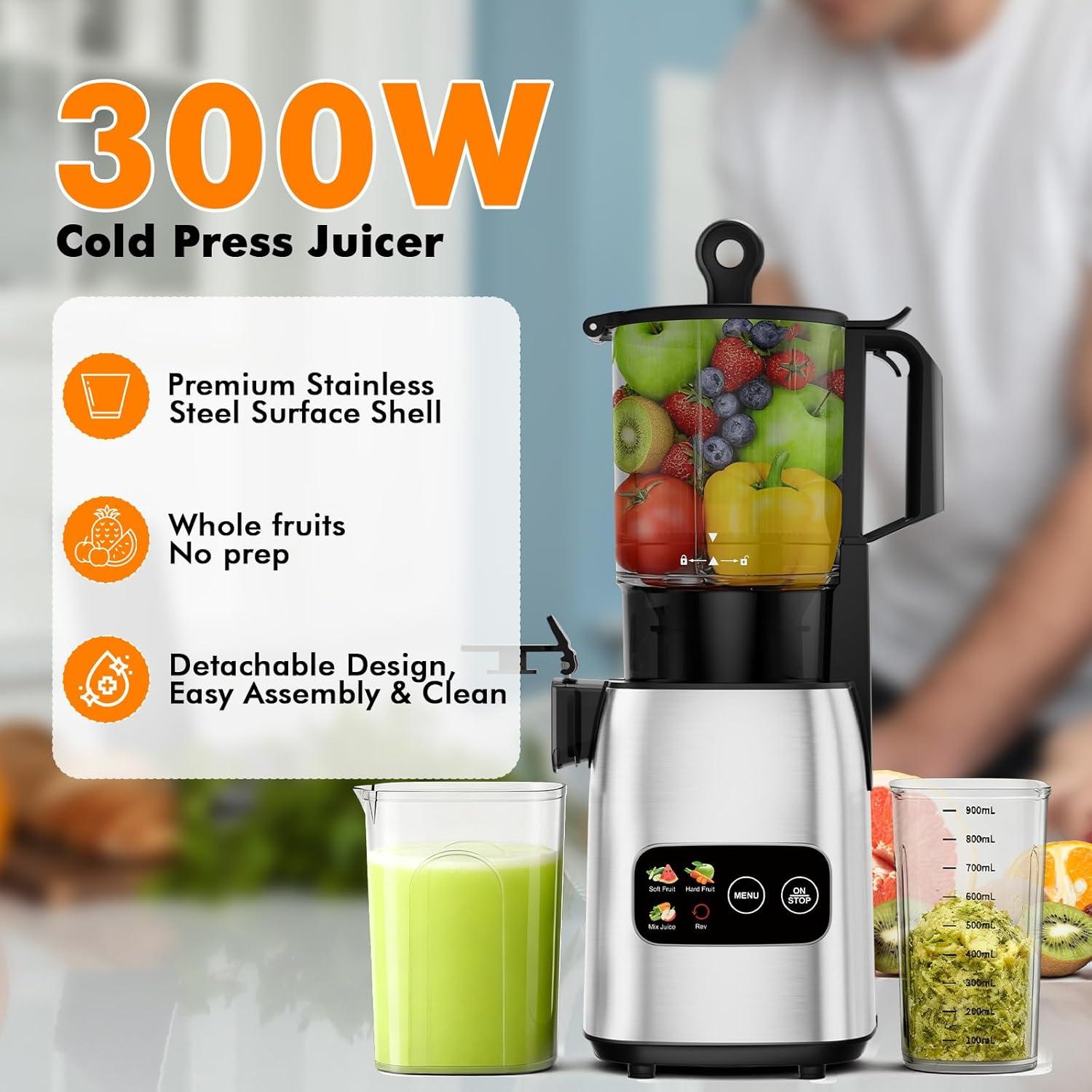 【Powerful Motor & High Efficiency】With a 300W High-power motor, our cold press juicer separates the pulp from the juice well, providing you with better-tasting, purer juice. Cold press technology maximizes the retention of nutrients and reduces oxidation, extracting a high yield of vitamins for your satisfying juicing experience. Enjoy fruit and leafy greens juices such as apple, carrot, orange, watermelon, ginger, celery, tomato and more!