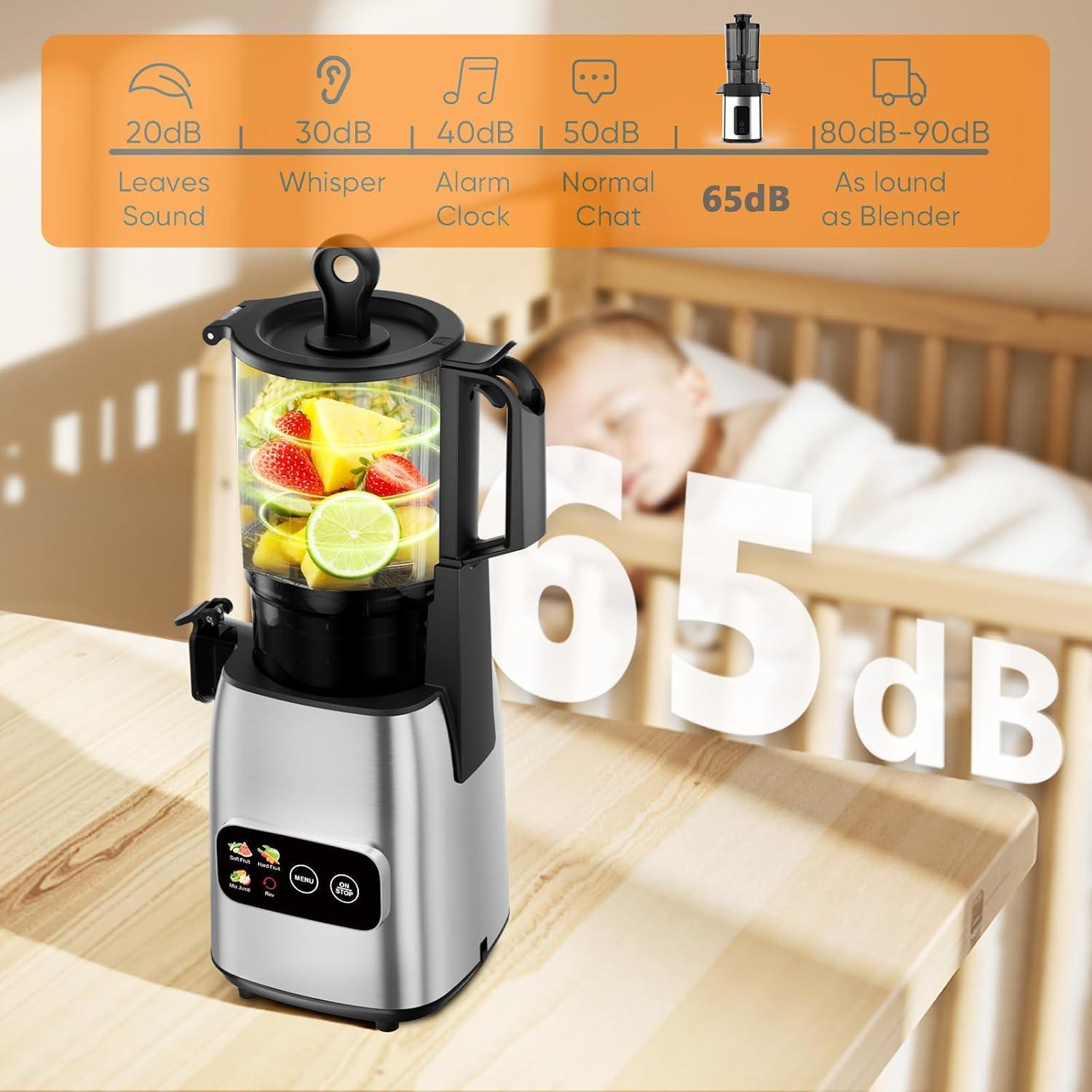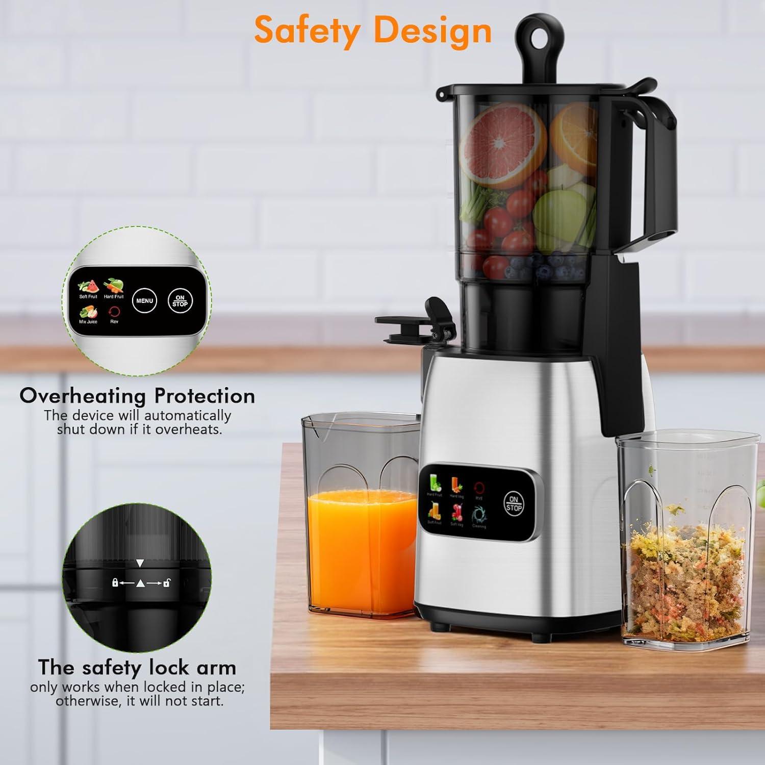 【5.4” Extra Wide Chute】Our 60 RPM slow masticating juicer locks in maximum nutrition, enzymes, and fresh flavor—no heat damage! The 5.4-inch wide feed chute fits whole apples, carrots, and oranges with no pre-cutting, saving time. Effortlessly make smooth, nutrient-dense juices from fruits/veggies, savoring pure natural goodness. Durable and reliable, it’s ideal for health-conscious families craving long-lasting homemade juice.