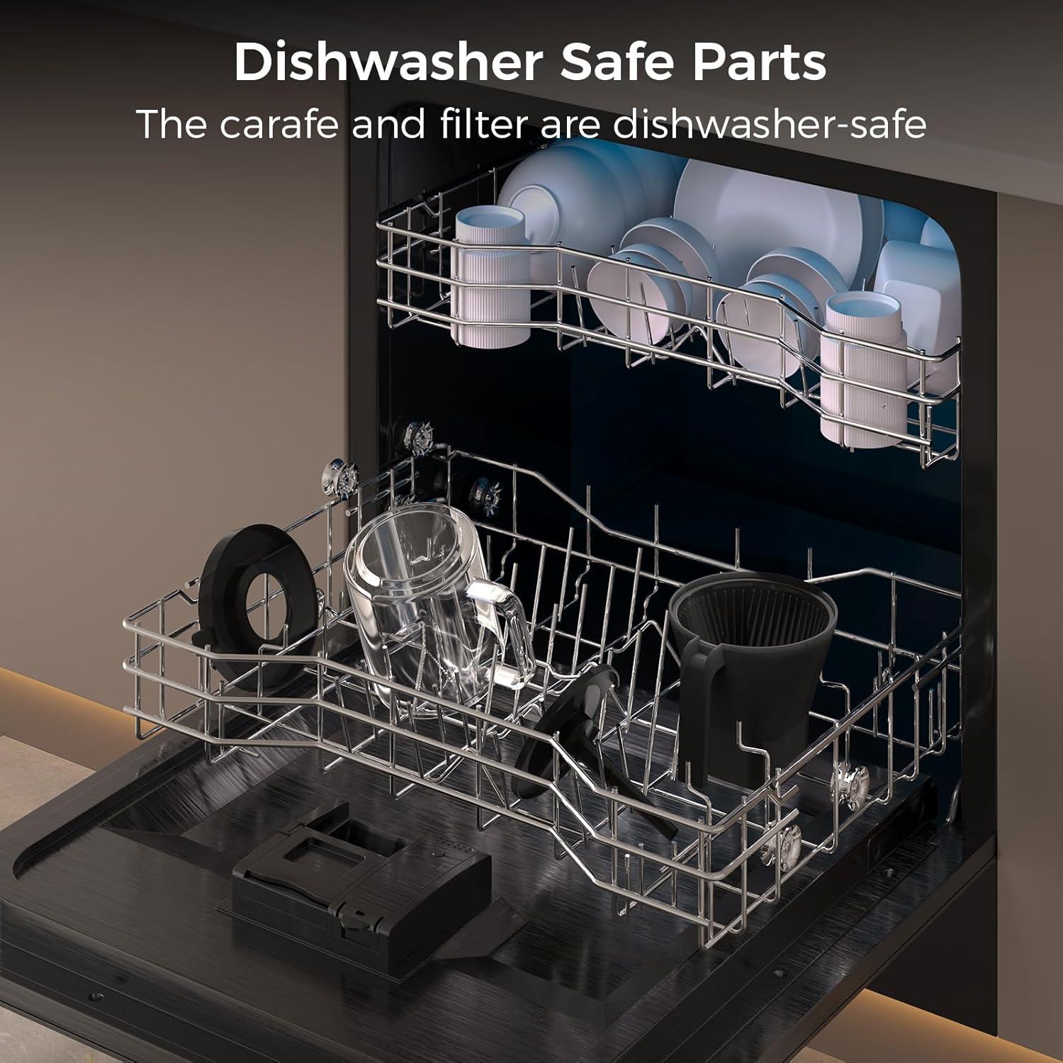 The removable water tank: The large, removable water tank lifts right off for easy filling at your sink and snaps back into place. The cleanup is just as simple. For added convenience, the extraction funnel and glass coffee carafe are dishwasher-safe, making electric coffee maker cleanup quick and hassle-free.