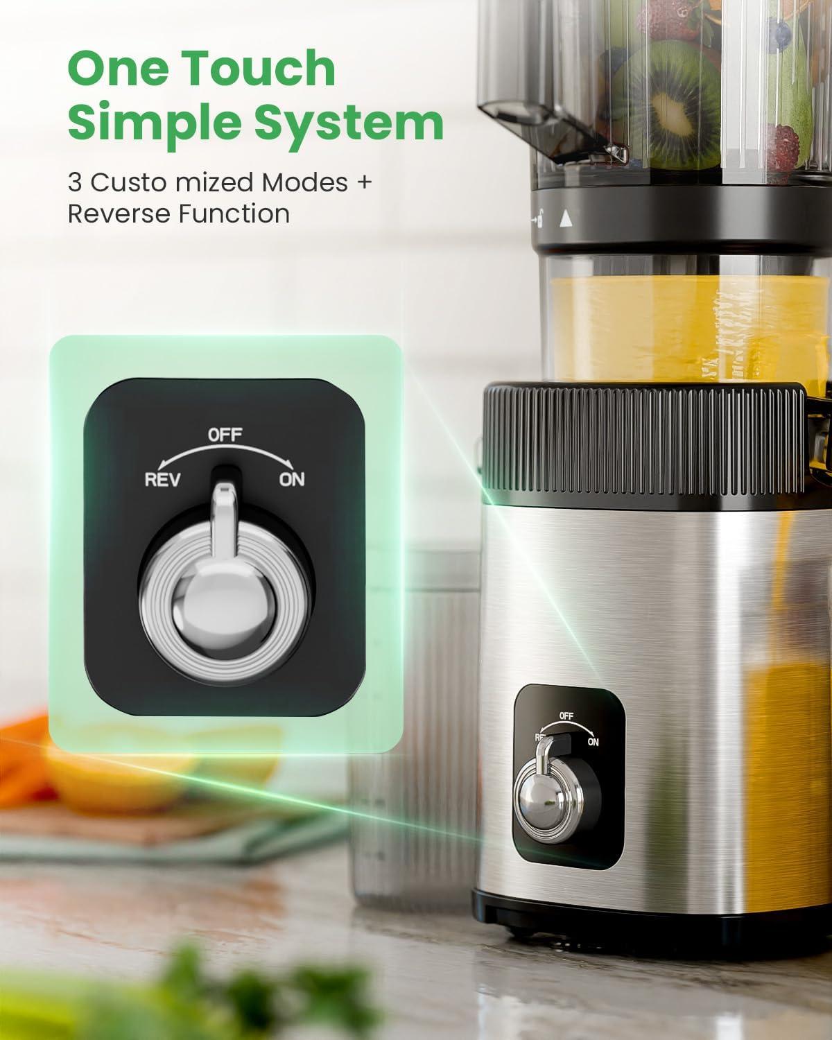 【Simple Control, Reliable Maintenance】Equipped with a classic knob, this juice press offers ON, OFF, and REV settings for straightforward use. Seniors and beginners can handle it with confidence. Its traditional design is durable, simple in mechanics, and has a low failure rate. A dependable masticating juicer choice among kitchen appliances for stress-free daily juicing.