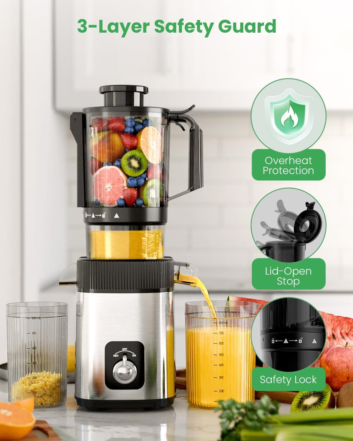 【Durable Build, Quiet Power】A stainless steel juicer shell combines with a DC motor that runs at just 65 dB. The quiet power of this cold press juicer machine delivers calm mornings and peaceful evenings, making it stand out among many electric juicers on the market.