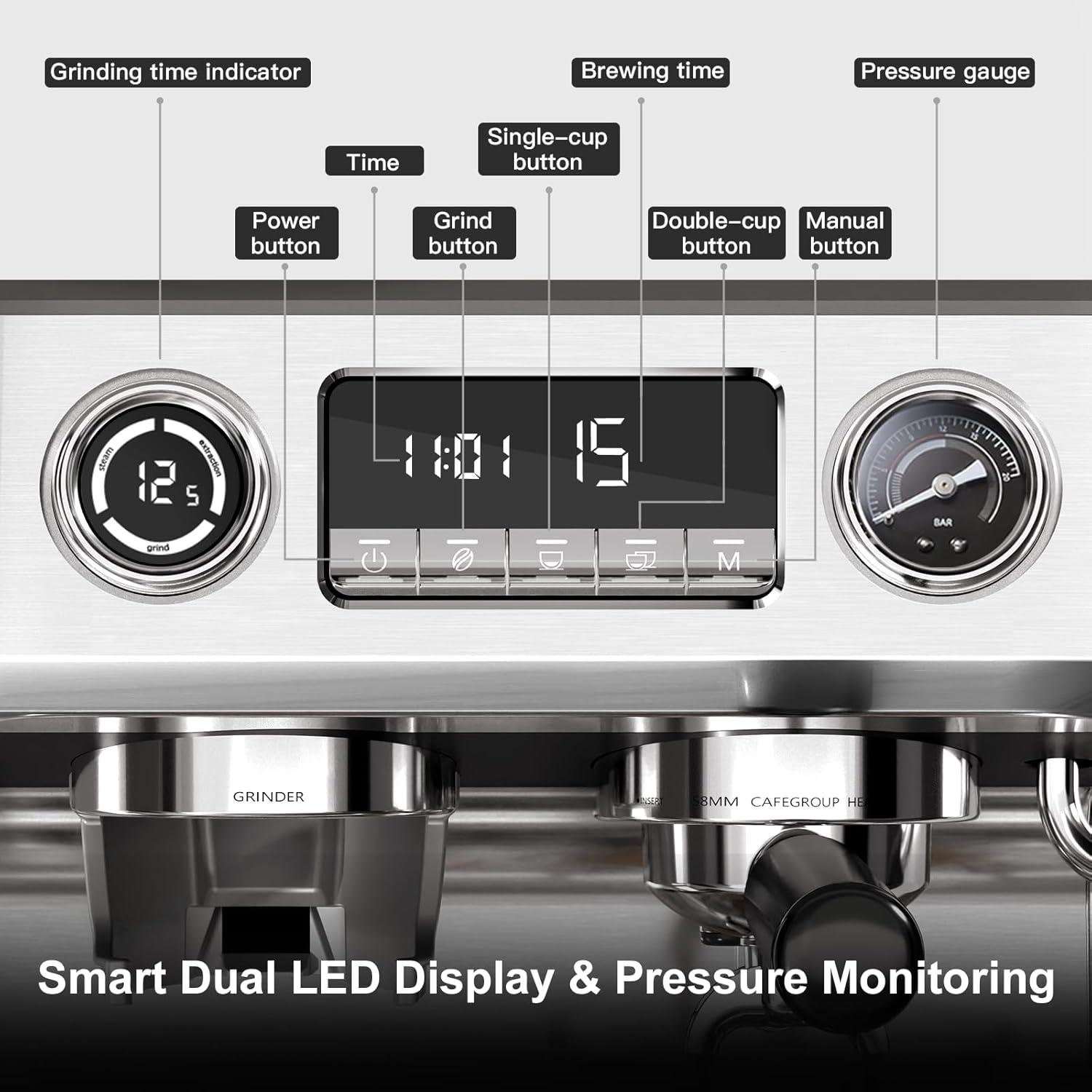 【Smart Display & Custom Brewing】Dual LED screens and pressure gauge show grind time, brew status, and pressure. The latte machine’s single/double cup buttons adjust extraction, grind, and pre-infusion. Easily customize timing and pre-brew amounts