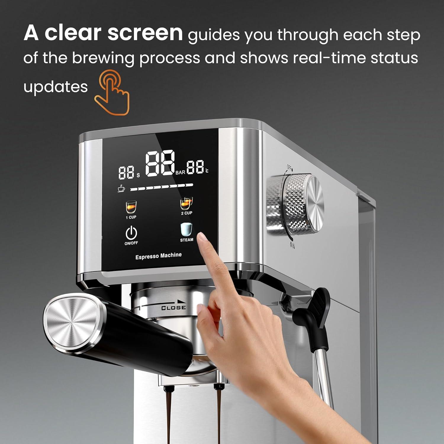 【Semi-automatic espresso machine】Made of high-quality stainless steel, this espresso machine ensures a durable and stylish aesthetic. In addition, this professional espresso machine takes only 1 minute to preheat and 15 to 25 seconds to make a single or double espresso, allowing you to enjoy a strong coffee at home