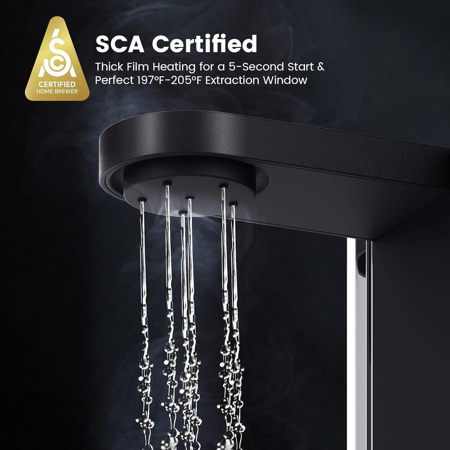 Rapid, Precision Heating System: Features thick-film heating technology for instant hot water in just 5 seconds. It maintains an optimal extraction temperature between 198°–205°F, certified to meet the exacting standards of both the SCA and ECBC