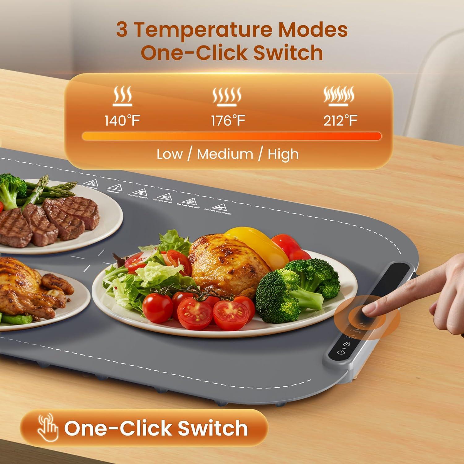 【Adjustable 3-Level Temperature Control】 The warming tray offers three preset temperature settings. With one-touch operation, you can precisely warm plates, thaw meat, proof dough, or heat facial masks—simply choose the setting that best meets your needs.