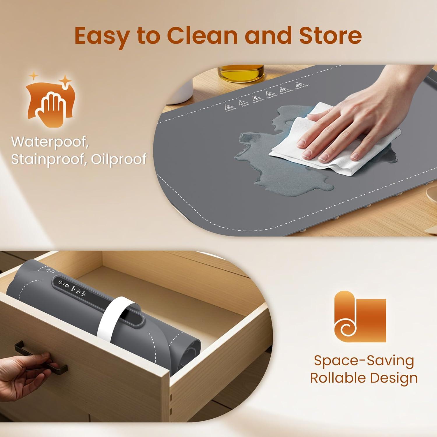 【Extra Large Size&Premium Material】Our warming tray is made of high-quality flexible silicone nano material, that is splash-resistant and can be easily wiped clean after use.The rollable and portable design ensures it easy to slip into any drawer or bag. Kitchen, RV, picnic,which is convenient and space-saving, flexible and compact, and easy to use.